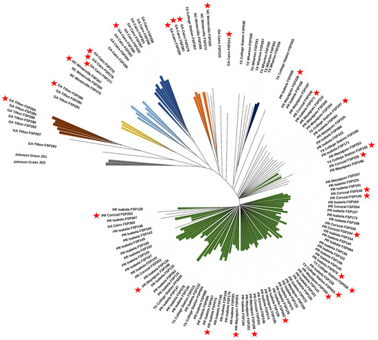 Unrooted neighbor-joining tree for 140 C. sublineola isolates collected in Georgia, Texas, North Carolina, and Puerto Rico. Colored branches represent isolates belonging to the eight populations found in the STRUCTURE analysis, while admixture isolates are not colored. The red stars represent isolates used for a virulence analysis against 18 sorghum differential lines.