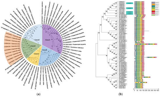 Bioinformatic analysis of GAFP genes. (a) Evolution tree of GAFP genes of the Orchidaceae family. The genes are grouped into five classes: A–E; (b) evolution tree of GAFP genes and their conserved motifs. Gastrodia elata GAFP1, GAFP2, GAFP3, and GAFP4 share 85% similarity.