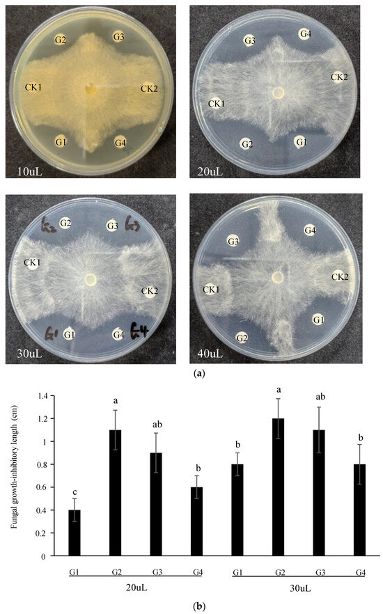 We cloned the four G. elata GAFP (GAFP1-4) genes that are highly homologous to evaluate their effects on R. solani growth on plates. We expressed these four genes in E. coli, purified them, and evaluated their effects on R. solani mycelial growth in cultural medium (Figure 2a). We found that all four GAFP proteins significantly inhibited R. solani mycelial growth at all four concentrations. We further measured the distances (mm) between the GAFP proteins and the closest R. solani mycelia for treatments with 20 μL and 30 μL protein; almost no visible differences were observed for the 10 μL and 40 μL treatments. We found that the distances of G2 and G3 were significantly longer than those of G1 and G4 in both treatments (Figure 2b), suggesting that G2 and G3 are more effective in inhibiting R. solani mycelial growth. No significant differences between G2 and G3 in inhibiting R. solani hypha growth were found, although the average distance of G2 was longer than that of G3. Together, these data showed that G2 and G3 were slightly more effective in inhibiting R. solani growth than G1 and G4 in the 20 and 30 μL treatments.