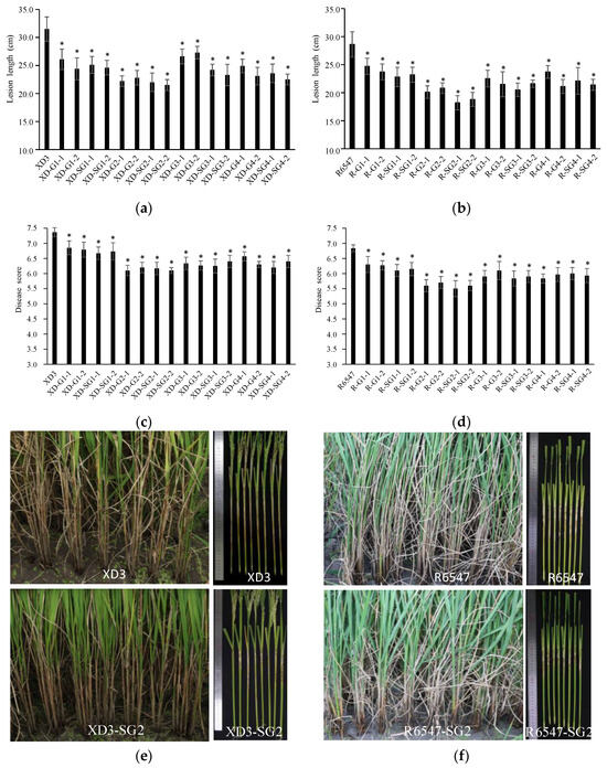 ShB resistance levels of different GAFP transgenic lines and their controls. (a,b) ShB lesion lengths of XD3 and transgenic lines (a) or R6547 and transgenic lines (b) in greenhouse inoculation assay. (c,d) ShB disease scores of XD3 and transgenic lines (c) or R6547 and transgenic lines (d) in field inoculation test. E–F. ShB disease pictures of XD3 and transgenic lines (e) or R6547 and transgenic lines (f) in greenhouse assay or in field inoculation test. * Indicates 5% level significant differences.