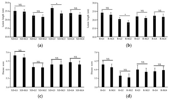 We further assessed the function of the signal peptide of GAFPs in disease resistance and found no significant differences between lines with or without the signal peptide, except for G2 vs. SG2 in the XD3 background and G3 vs. SG3 in the R6547 background in the greenhouse assay (Figure 5a,b). Because in both significant cases the SG lines developed shorter lesions than the G lines and other SG lines tended to have shorter lesions than their corresponding G lines (Figure 5a–d), GAFP constructs carrying a signal peptide may be more stable in conferring resistance to ShB in rice.