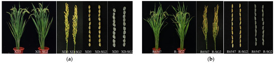 Comparison of whole plants, panicles, and grains of GAFP transgenic lines and controls. (a) Whole plants, panicles, and grains of XD3 and transgenic line XD-SG2. (b) Whole plants, panicles, and grains of R6547 and transgenic line R-SG2.