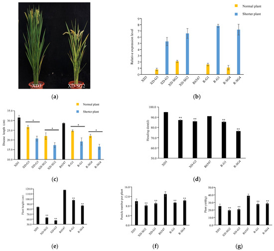 Comparison of plant morphology, ShB resistance, and agronomic traits of normal and shorter transgenic plants. (a) Plant morphology of XD3 and transgenic line XD-SG2. (b) Comparison of GAFP RNA levels of two different transgenic lines with normal or shorter plant height for XD-G3, XD-SG2, R-G1, and R-SG4. (c–g) ShB lesion length (c), heading date (d), plant height (e), panicle numbers per plant (f), and grain yield per plant (g) of transgenic lines with normal or shorter height and controls. * Indicates 5% and ** indicates 1% level significant differences.