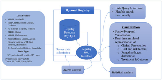 Figure 1. Flow diagram depicting the database registry developed for the collection, storage, and dissemination of the MycoNet data (https://clinicomycoregistry.icmr.org.in/, accessed on 2 November 2023).