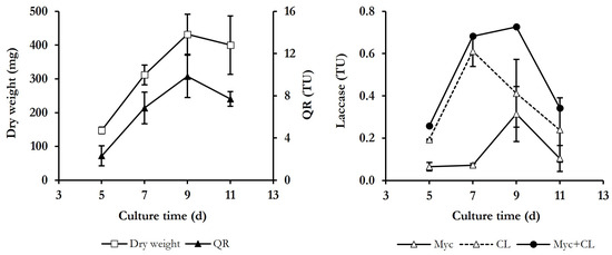 Time course of dry weight, quinone reductase (QR), and laccase, both bound to the mycelium (Myc) and in the culture liquid (CL), in cultures of P. eryngii. Total units (TU) of enzyme activities are shown.
