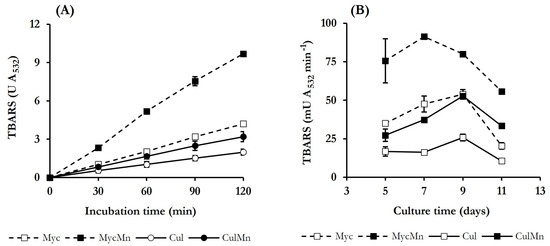 Production of TBARS by P. eryngii incubated under quinone redox cycling (QRC) conditions, using whole cultures (Cul) or washed mycelia (Myc): (A) Time courses of TBARS production in 5-day-old cultures; (B) TBARS production rates as a function of culture age. Incubations were carried out at pH 5.0 (20 mM phosphate buffer) and contained 500 μM 2,6-dimethoxy-1,4-benzoquinone (DBQ), 100 μM Fe3+-300 μM oxalate and, when indicated, 100 μM Mn2+. Incubation blanks lacked either DBQ or Fe3+-oxalate complex.