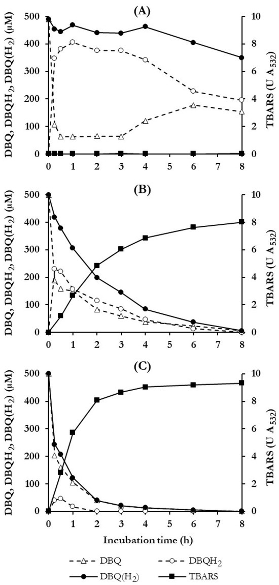 Time course of DBQ, DBQH2, the sum of both, i.e., DBQ(H2) and TBARS production, during DBQ redox cycling in P. eryngii. Incubations contained 30 mL of 20 mM phosphate buffer, pH 5.0, 7-day-old, washed mycelium (50 ± 5 mg, dry weight), 2,8 mM deoxyribose and: (A) 500 μM DBQ; (B) 500 μM DBQ and 100 μM Fe3+-300 μM oxalate; (C) 500 μM DBQ, 100 μM Fe3+-300 μM oxalate and 100 μM Mn2+.