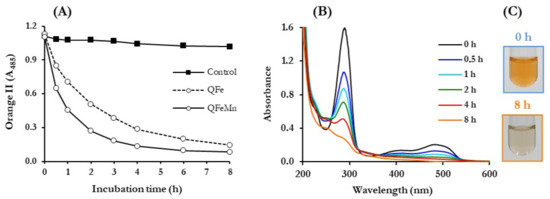 Advanced oxidation of the azo dye Orange II by P. eryngii. (A) Time course of decolourisation; (B) changes in UV/Vis spectra of diluted samples from incubations with Mn2+ along the incubation time; (C) pictures of QFeMn incubation samples taken at 0 and 8 h. Incubations contained 30 mL of 20 mM phosphate buffer, pH 5.0, 7-day-old, washed mycelium (50 ± 5 mg, dry weight), 50 μM Orange II, 500 μM DBQ, 100 μM Fe3+-300 μM oxalate (QFe incubations) and 100 μM Mn2+ (QFeMn incubations). Control incubations lacked DBQ, iron complex and Mn2+.