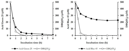 Advanced oxidation of the anthraquinone dyes Acid Green 25 and Acid Blue 45 by P. eryngii, showing the time courses of the dyes and DBQ(H2) in QFeMn incubations.