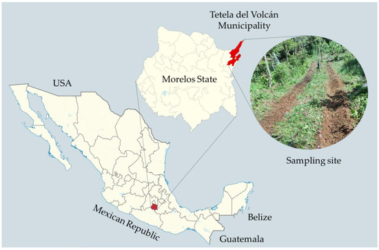 Figure 1. Map of the Mexican Republic, the State of Morelos, the Tetela del Volcán Municipality, and a picture of the sample site.