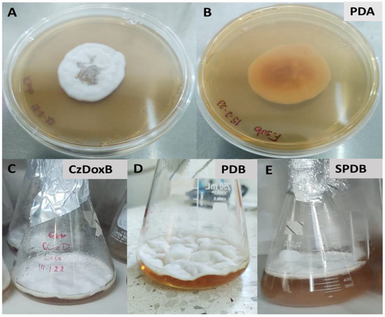 Regarding the macroscopic characteristics of F. subprimulinum growing in PDA plates after 10 days, the growth appeared circular and concentric, with a 4.5 cm diameter and a whitish and cottony aspect from the front view; the reverse of the plate appeared yellowish (Figure 2A,B). In flasks with liquid media, the fungus covered almost the whole surface of the medium with whitish and cottony mycelia, forming wrinkles (Figure 2C–E). After 10 days of incubation, this isolate showed slow and poor growth in the PDA medium. In contrast, an abundant production of mycelial biomass was observed in the three liquid culture media (Cz-DoxB, SPDB, and PDB) (Figure 2C–E).