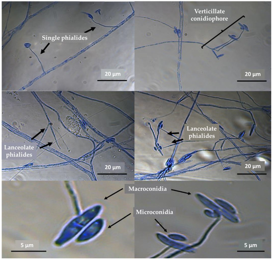 Regarding the microscopical analysis of the aerial structures, the isolated fungus showed the following characteristics: the presence of macroconidia and microconidia arising from the apex of the lanceolate phialides and the presence of verticillated conidiophores with one to three phialides (Figure 3).