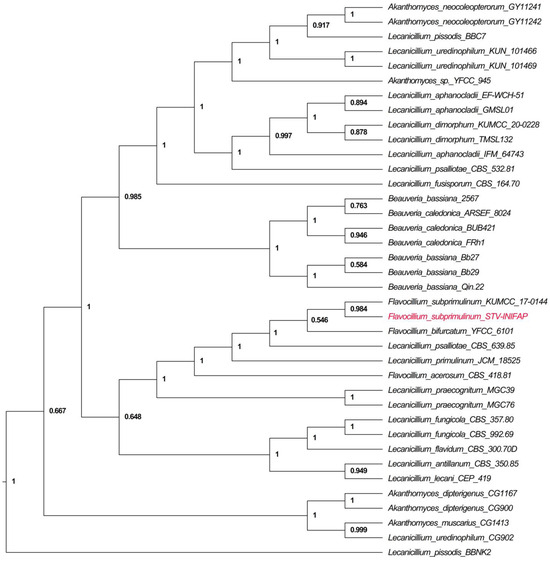 Figure 4. Phylogenetic tree constructed by Bayesian Inference with the ITS-TEF-linked sequences using sequences from strains reported in the NCBI database to compare with Flavocillium subprimulinum (STV-INIFAP F. sub-strain, highlighted in red color). Note: Values in the nodes are the posterior probabilities; only values above 0.5 were considered.