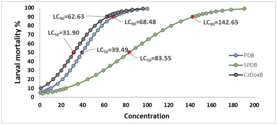 Figure 5. Logistic regression by the PROBIT method; lethal concentrations 50 and 90 (LC50 and LC90) estimated for the three media culture filtrates, potato-dextrose broth (PDB), sweet potato-dextrose broth (SPDB), and Czapek–Dox broth (CzDoxB). R2 = 0.92.