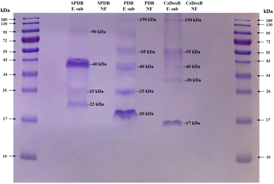 Protein profile analysis was performed using lyophilised liquid culture filtrates. The lyophilised FLCF was resuspended in PBS (pH = 7.2) at 100 mg/mL, and the total protein concentration was estimated using a Qubit™ Protein Assay Kit (Invitrogen, Eugene, OR, USA). The proteins from the fungus produced in each culture medium were separated for their observation by sodium dodecyl sulphate–polyacrylamide gel electrophoresis (SDS–PAGE) at 5% and 12%. In addition, zymogram gel electrophoresis (5% gelatine) was performed to visualise the protease activity. A total of 3 µg of total protein were used for SDS-PAGE, and 1 µg was added to the zymogram gel for each treatment. The treatments evaluated in both gels were established as follows: PDB with fungus, PDB without fungus, SPDB with fungus, SPDB without fungus, Cz-DoxB with fungus, and Cz-DoxB without fungus [30].