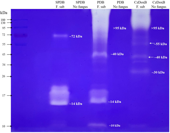 The zymogram of F. subprimulinum grown in three liquid media and controls is shown in Figure 8. The zymogram revealed the presence of two bands with protease activity, weighing 72 and 14 kDa, in the fungus grown in the SPDB medium. In PDB, three bands with protease activity were identified: 40, 14, and 10 kDa. In CzDoxB, four protein bands with protease activity were identified, weighing ~95, 55, 40, and 30 kDa. The control lines with only media without any fungi were negative.