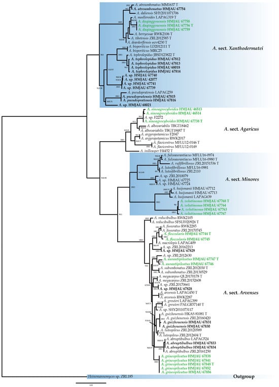 This study involves four sections of four subgenera, viz., A. sect. Agaricus in A. subg. Agaricus, A. sect. Arvenses in A. subg. Flavoagaricus, A. sect. Minores in A. subg. Minores and A. sect. Xanthodermatei in A. subg. Pseudochitonia, in the system by Zhao et al. (2016).