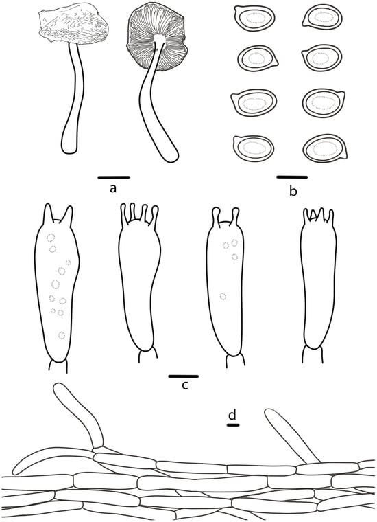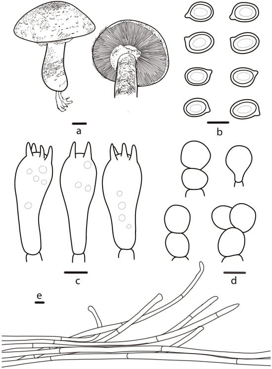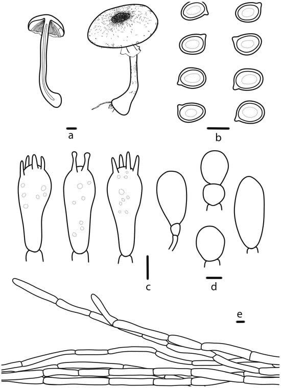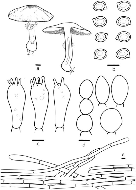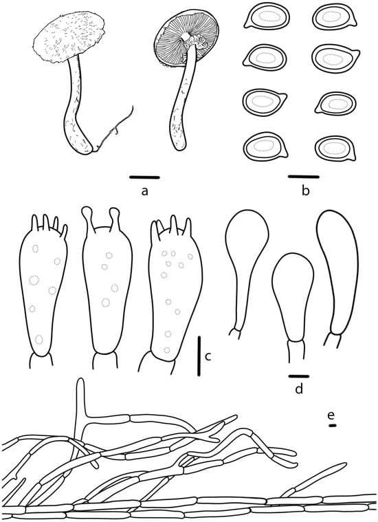 Agaricus daqinggouensis (HMJAU 67756, HMJAU 67759) (a) Basidiomata, (b) Basidiospores, (c) Basidia, (d) Cheilocystidia, (e) Pileipellis. Bars: (a) = 1 cm, (b–e) = 5 μm.