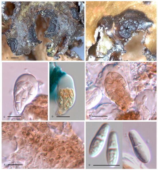 Arthonia boomiana (holotype). (A,B) Apothecia of the fungus on lobes of Nephromopsis chlorophylla. (C) Ascus (water). (D) Ascus (KI). (E) Ascus with brown spores (water). (F) Epihymenium with top cells of paraphysoids. (G) Ascospores. Scales: (A,B) = 250 µm, (C–G) = 10 µm.