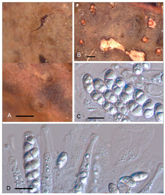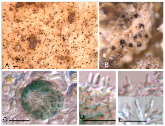 Apothecia are cream- to brown-colored, not black as in original description. Exciple, brown in the original description [19], is different on our samples, being hyaline, formed by a cartilaginous tissue, and only brown on the outer part. In one sample, we found only dispersed pycnidia and hyaline conidia with obtuse ends, 5–7 × 2–2.5 µm, with two hyaline droplets.