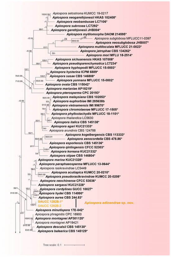 - Notes—Phylogenetic analyses based on ITS-LSU-TEF1α-TUB2 rDNA sequences showed that Apiospora adinandrae sp. nov. formed an independent clade which is closely related to A. aurea (CBS 244.83), A. hydei (CBS 114990) and A. cordylines (GUCC 10027). The base-pair comparison of ITS, LSU, TEF1α and TUB2 sequences, respectively, showed 1.01%, 0.48%, 6.81% and 3.62% differences between A. adinandrae (SAUCC 1282B-1) and A. aurea (CBS 244.83); showed 1.18%, 0.36%, 6.79% and 4.75% differences between A. adinandrae and A. hydei (CBS 114990); and showed 1.04%, 0%, 6.47% and 4.97% differences between A. adinandrae and A. cordylines (GUCC 10027);