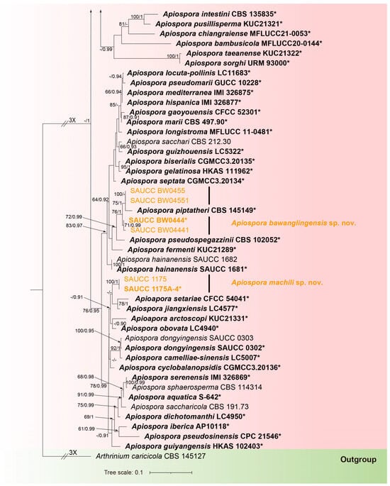A maximum likelihood tree showing the phylogenetic relationships of Apiospora inferred from the ITS, LSU, TEF1α and TUB2 sequences, and the roots on Arthrinium caricicola (CBS 145127). The Bayesian inference posterior probability (left, BIPP ≥ 0.90) and the maximum likelihood bootstrap value (right, MLBV ≥ 50%) are shown as BIPP/ML above the nodes. Strains marked with a star “*” and bolded represented are ex-types or ex-holotypes. Strains from the present study are in orange. The scale in the bottom middle indicates 0.1 substitutions per site. In order to make the layout of the evolutionary tree beautiful, some branches are shortened by two diagonal lines (“/”) with the number of times.