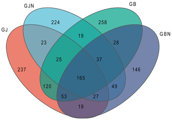 Venn diagram showing the numbers of fungal OTUs identified in GJ, GJN, GB, and GBN samples (healthy rhizosphere soil, healthy root, diseased rhizosphere soil, and diseased root, respectively).