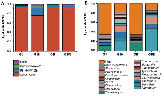 Relative abundance higher than 0.01% at the phylum and genus levels was observed; “other” was defined as the relative abundance of less than 0.01%, and unclassified phyla and genera. The most predominant fungal phyla were Ascomycota (49.89–99.56%) and Basidiomycota (0.33–25.78%) (Figure 3 and Figure S5). Glomeromycota (0.08–1.17%) was the predominant phylum only in the GJN group samples. Olpidiomycota (0.04–1.75%) as the predominant phylum only appeared in GBN393 and GBN211 samples. Only Mortierellomycota was not the dominant phylum in the GBN group samples. The relative abundance of Mortierellomycota (20.98%) was the highest in GJN376 samples.