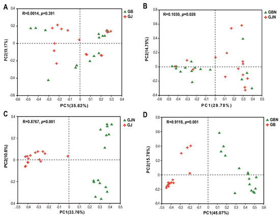 In the β-diversity analysis of groups samples, there were no significant differences in the fungal communities of healthy and diseased samples in the rhizosphere groups (Figure 4A). There were significant differences between GBN and GJN, GJN and GJ, and GBN and GB (R = 0.1030, p = 0.026; R = 0.8767, p = 0.001; R = 0.9118, p = 0.001) (Figure 4B–D), indicating a clear distinction between the fungal community composition of rhizosphere and endosphere samples and healthy and diseased endosphere samples.