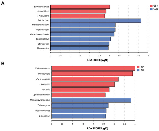 LEfSe analysis of significantly enriched fungal communities between (A) GBN and GJN and (B) GB and GJ. Fungal genera with an LDA score of >2 are shown. GJ, GJN, GB, and GBN represent healthy rhizosphere soil, healthy root, diseased rhizosphere soil, and diseased root samples, respectively.