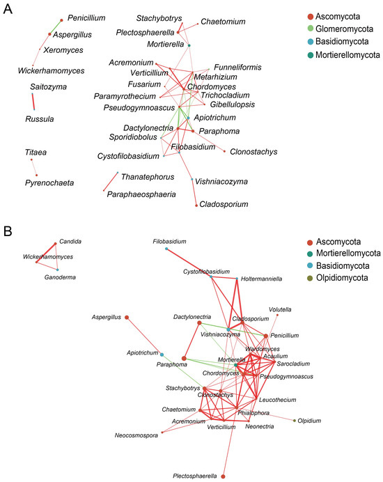 Co-occurrence network of fungi between rhizosphere and endosphere from (A) healthy and (B) diseased samples at the genera level. Only p-values of <0.05 and Spearman correlation coefficients of >0.5 are represented in the network. Colored dots represent phyla, with size positively correlated with abundance. Red edges indicate positive correlations, and green edges indicate negative correlations.
