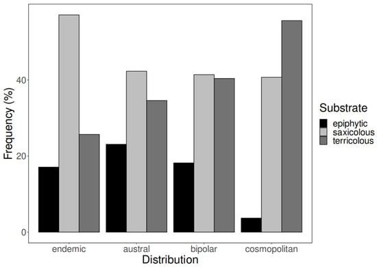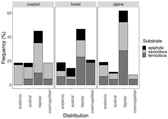 The set of common species between Navarino Island and maritime Antarctica has been divided into four biogeographical groups according to Sancho et al. 1999 [], Oevstedal and Lewis Smith 2001 [], Olech 2004 [], and Soechting et al. 2004 []: Antarctic–subantarctic endemic, which includes the subantarctic islands and the Cape Horn region; austral, i.e., Southern Hemisphere distribution; bipolar, species distributed throughout both polar regions as well as in the high mountains of both hemispheres; and cosmopolitan, species with a broad distribution around the globe. Shared specimens have also been categorised according to a simplified version of the three main altitudinal belts of Navarino Island: coastal area, forest, and alpine region. The coastal habitat consists of trees close to the sea, pebble beaches, cliffs, and rocky intertidal zones; the forest (from around a hundred-meter distance from the shore up to about 500 m a.s.l.) includes both evergreen subantarctic Magellanic rainforests and deciduous forests; and the alpine or high Andean habitat (above 500 m a.s.l.) comprises low shrubs, cushion plants, and rocks scattered beyond the timberline. Each species of the Antarctic–Fuegian flora has been assigned to the substrate(s) on which it was found on Navarino Island. Lichens growing on trunks, branches, wood, and bark on trees were considered epiphytic, as were those found on the branches of cushion bog shrubs such as Bolax gummifera and Empetrum rubrum in the alpine region. Specimens growing on rocks were classified as saxicolous, while those that developed on soil, humus, grasses, mosses, liverworts, and/or other lichens were seen as terricolous. It should be noted that substrate type and habitat are not mutually exclusive as some species were found living on different substrates across more than one habitat. All possibilities were taken into consideration for our study.