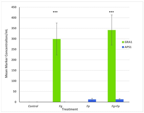 To compare the response to the different inocula using a DNA marker gene, the ratio of the GRA1 gene to the APS1 gene was used. Multiple ANOVA was used to analyze the effects of cultivar, treatment, and replicate on the ratio of mean GRA1 concentration to mean APS1 concentration; of the comparators used, only treatment had a statistically significant effect (p < 0.05). The ratios of GRA1 to APS1 between Fg-treated and co-inoculated (Fg + Fp) samples were similar; that is, the GRA1-to-APS1 ratio in samples treated with Fp alone was significantly lower than in the Fg-treatment and co-inoculated samples (Fg + Fp) (Figure 2).