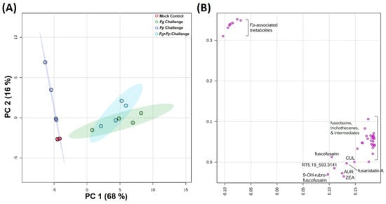 Results from PCA analysis of barley cultivar Stander, comparing F. graminearum and F. poae secondary metabolite mass feature associations between monoculture and co-culture pathogen challenges. (A) PC1-2 score plot (red dots = mock control samples; green dots = F. graminearum monoculture samples; dark-blue dots = F. poae monoculture samples; light-blue dots = F. graminearum and F. poae co-culture samples). (B) PC1-2 loading plot representing mass feature variables (Fp = F. poae).