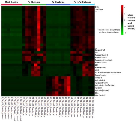 A heatmap of mass feature relative abundance was constructed using scaled intensities to view the distribution of metabolite production between the various in planta challenge samples (Figure 4). As was observed from the PCA models, both F. graminearum and F. poae monoculture samples had distinct and different secondary metabolite compositions. Metabolite production was comparable with only minor variations observed between Stander and CDC Bold cultivars in the various in planta challenge samples. In the F. graminearum/F. poae co-culture challenge experiments, F. graminearum-associated secondary metabolites were more abundant in infected tissues as compared to F. poae metabolites. The observed differences in secondary metabolite relative abundance reflected the observed trends from the PCA modeling, in that some differences were observed between sample replicates, especially in terms of the relative abundance from F. poae-associated metabolites (in both monoculture and co-culture samples). As was noted earlier, no evidence was observed of trichothecene production in the F. poae monoculture challenge in either barley cultivar, nor was a discernable increase in trichothecene production (in terms of relative abundance) observed between F. graminearum monoculture samples and F. graminearum/F. poae co-culture samples (except a single F. graminearum sample replicate in CDC Bold).