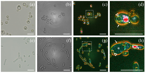 Bright-field and D-FF-OTT imaging of Candida albicans (a–d) and Candida parapsilosis (e–h). Bright-field imaging of Candida albicans (a) and Candida parapsilosis (e). FF-OTT (b,f) and D-FF-OTT (c,d,g,h) of Candida albicans (upper row) and parapsilosis (lower row). Dashed squares in Figure 2 (c,g) are shown with a higher magnification in (d,h). White arrows indicate cell membranes, empty triangles indicate nuclear membranes, and white-filled arrowheads point out organelles. Scale bars represent 10 μm.