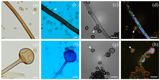 Optical and FF-OTT imaging of Rhizopus arrhizus. Optical imaging of unstained (a,e) and lactophenol blue-stained (b,f) fungi. FF-OTT (c,g) and D-FF-OTT (d,h) of similar structures. White arrowheads indicate sporangiospores. Scale bars represent 10 μm.