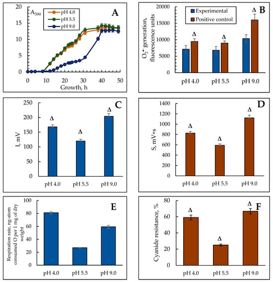 The effect of ambient pH on the growth (A), total ROS generation (B), BCL intensity (C,D) respiratory activity (E), and alternative oxidase induction (F) in Y. lipolytica W29 yeast grown at various pHs. (A)—absorbance was assessed in cell suspension at the wavelength of 590 nm (A590); (B)—fluorescence intensity (units), reflecting total ROS generation in 60 min after the cell staining with H2DCF-DA at various pHs (blue columns). Cells exposed to pro-oxidant 600 μM AAPH were used as the positive control (brown columns). The incubation medium for the experiments contained 50 mM KPi, and 1% glucose, pH 5.5. Δ—statistically significant difference compared to the corresponding control, p < 0.005. Values are mean ± S.E.M from 5–6 independent experiments.