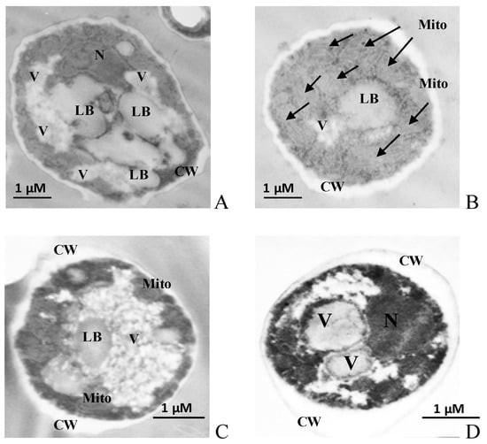 Ultrastructure (A–D) of the Y. lipolytica W29 cells. (A,B)—pH 5.5; (C)—pH 4.0; (D)—pH 9.0. N—nucleus, Mito—mitochondria, V—vacuole, LB—lipid bodies, CW—cell wall. Mitochondria are also indicated by arrows.