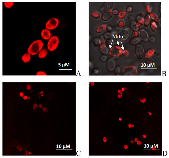 In addition, the ultrastructure analysis showed that the cells grown under all the tested conditions had a dense cell wall with noticeable seals in the scar areas, especially pronounced at pH 4.0 and 9.0 (Figure 2C,D), which is, apparently, a protective reaction to stress. In all the cases, the cytoplasmic membrane formed deep invaginations. However, the cells grown at extreme pH showed noticeable vacuolization in the cytosol. Yeast vacuoles are complicated organelles involved both in the enzymatic protein degradation and the homeostasis of soluble compounds, namely, ions, sugar alcohols, and amino acids [58]. Of particular interest is the capability of yeast cells to accumulate some proline, an amino acid protecting cells against various stress, namely, heat shock, dehydration, and oxidative stress [58]. Proline can not only stabilize membrane structures but also intercept the ROS. So, in [59], the protective function of vacuoles as proline cellular depot was shown at various stresses using the S. cerevisiae cells. It is notable that the cytoplasmic space of the Y. lipolytica cells was rich in well-developed mitochondria of the near-wall location, with a pronounced cristae structure (Figure 2B). Potentiometric staining of cells with MitoTracker™ Red dye demonstrated a high induction of yeast mitochondria under both optimal (Figure 3A,B) and stress conditions (Figure 3C,D), which agreed well with the high respiration rate of the Y. lipolytica cells reflecting high metabolic activity at extreme pH.