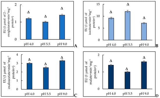 The activity of NAD-IDH (A), AH (B), NAD-MDH (C), and FH (D) in the Y. lipolytica cells grown at pH of 4.0, 5.5, and 9.0. * A unit of enzymatic activity (EU) is calculated as the amount of enzyme needed for 1 μmol of the final product for 1 min at a temperature of 25 °C. Δ—statistically significant difference compared to the corresponding control, p < 0.005. Values are mean ± S.E.M from 5–6 independent experiments.
