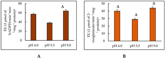 The activity of NADPH-producing enzymes in the Y. lipolytica yeast at extreme pHs. (A)—G6PDH; (B)—NADP-IDH. * The amount of enzyme catalyzing the formation of 1 μmol of the reaction product in 1 min at a temperature of 25 °C was taken as a unit of enzymatic activity (EU). Δ—statistically significant difference compared to the corresponding control, p < 0.005. Values are mean ± S.E.M. from 5–6 independent experiments.