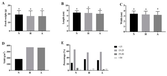 The effect of different nutrient bag formulae on the biomass and yield of M. sextelata. (A) Single fruiting body fresh weight. (B) Fruiting body length. (C) Fruiting body width. (D) Yield of per m2. (E) Fruiting body fresh weight distribution. N, H, and A refer to the proportions of pear sawdust in the nutrient bag: none, half, and all, respectively. Different letters indicate significant differences at p < 0.05.