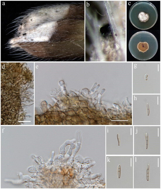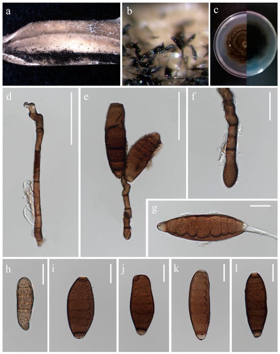 Bipolaris chiangraiensis (MFLU 24-0090, holotype). (a) Appearance of conidial mass on panicle of Oryza sativa; (b) Close-up of conidiophores and conidia on the substrate; (c) Top and reverse of colony on PDA; (d) Conidiophore; (e) Conidiogenous cells and conidia; (f) Base of conidiophore; (g) Unipolar germinating conidium; (h–l) Conidia from immature to mature. Scale bars: (d–e) = 50 μm; (f–l) = 20 μm.