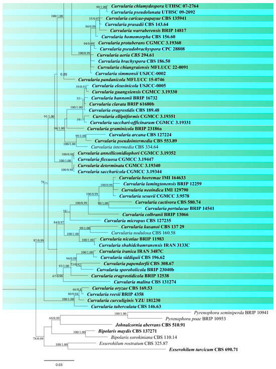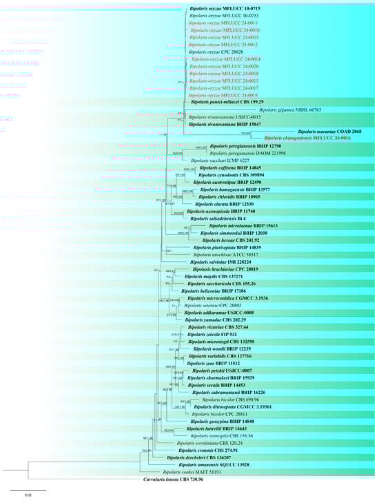 Notes: Based on phylogeny, our isolate is closely related to the type strain of Curvularia chiangmaiensis (CPC 28829) with 65% ML and 0.87 BYPP support (Figure 3). It is challenging to identify most Curvularia species from one another by employing solely morphological characteristics. For precise species identification, the use of both morphological and molecular methods should be considered [61,62]. The pairwise DNA sequence comparison and morphological differences were not noticeable; therefore, we identified this isolate as C. chiangmaiensis based on phylogenetic analysis and morphological comparison. Our strain (MFLUCC 24-0024) differs slightly from CPC 28829 in the shape and size of conidia [60].