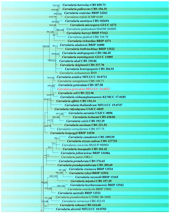 Notes: Based on the morphological and molecular data isolate MFLUCC 24-0022 was identified as a representative of C. geniculata with 88% ML and 0.98 BYPP support (Figure 3). This species is a cosmopolitan fungus that is most prevalent in tropical countries and can occur on a variety of host plant species [45]. Curvularia geniculata is one of the most common Curvularia species found on rice and has been reported in various countries such as Bangladesh, Brunei Darussalam, China, India, Japan, Malaysia, Papua New Guinea, Tanzania, and Uganda. [26,64,65,66]. It was reported as a saprobe on wild bananas in Thailand [67], but there are no records from rice.