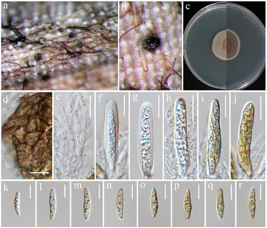 Sexual morph of Phaeosphaeria musae (MFLU 24-0316, new host record). (a,b) Appearance of ascomata on the panicle of Oryza sativa; (c) Top and reverse of colony on PDA; (d) Peridium; (e) Pseudoparaphyses; (f–j) Asci; (k–r) Ascospores. Scale bars: (d–r) = 10 μm.
