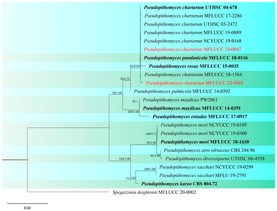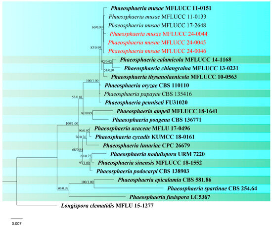 Phylogenetic tree of Phaeosphaeria generated from a maximum likelihood analysis based on concatenated ITS, LSU, SSU, and tef1 sequence data. A total of 24 strains were included in the combined analyses, which comprised 2986 characters after alignment. Nodes on the tree were supported by bootstrap values, with values ≥50% for RAxML and ≥0.7 for Bayesian posterior probabilities (BYPP). Isolates from the current study are in red, while ex-type strains are in bold black. The tree was rooted with Longispora clematidis (MFLU 15-1277), and the scale bar represents the expected number of nucleotide substitutions per site.