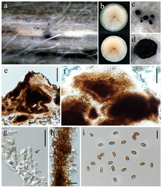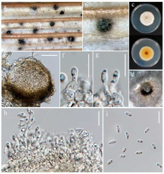 Setophoma poaceicola (MFLU 24-0318). (a,b) Appearance of conidiomata on the stem of Oryza sativa; (c) Top and reverse of the colony on PDA; (d) Conidiomata superficial on PDA after four weeks; (e) Section through pycnidium. (f–h) Conidiogenous cells. (i) Conidia. Scale bars: (e) = 30 μm; (f–i) = 20 μm.