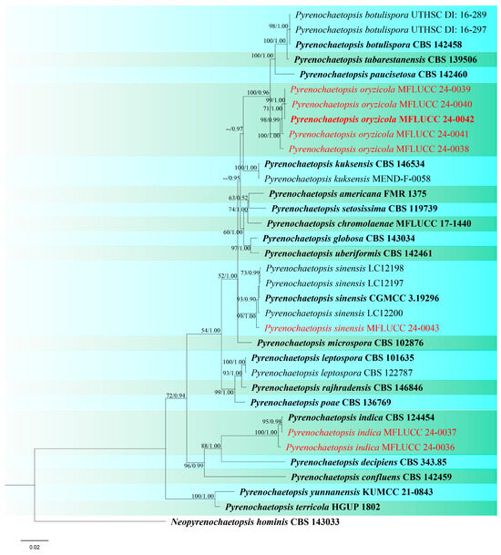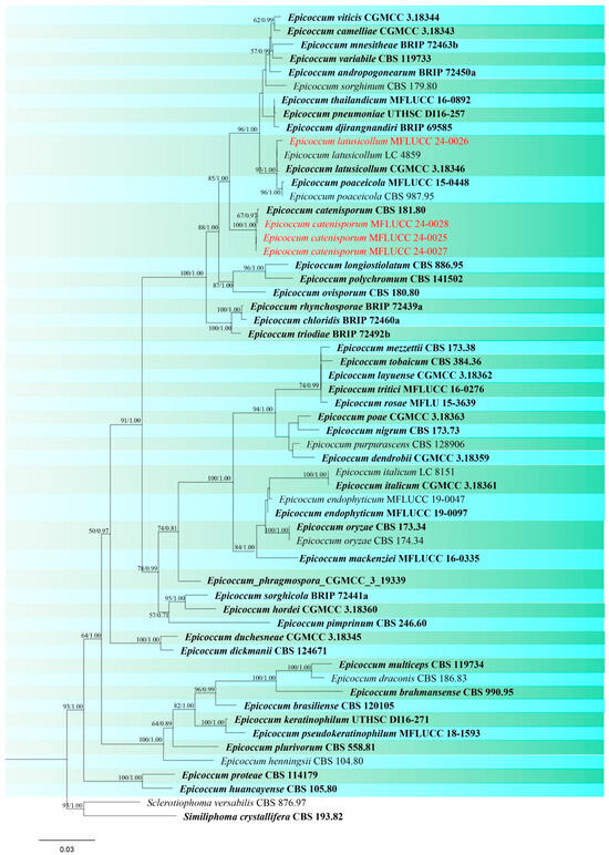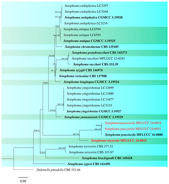 Phylogenetic tree of Setophoma generated from a maximum likelihood analysis based on concatenated ITS, LSU, rpb2, and tef1 sequence data. A total of 29 strains were included in the combined analyses, which comprised 2509 characters after alignment. Nodes on the tree were supported by bootstrap values, with values ≥50% for RAxML and ≥0.7 for Bayesian posterior probabilities (BYPP). Isolates from the current study are in red, while ex-type strains are in bold black. The tree was rooted with Didymella pinodella (CBS 531.66), and the scale bar represents the expected number of nucleotide substitutions per site.